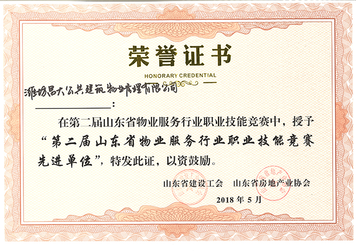 2018年5月被評為第二屆山東省物業服務行業職業技能競賽現進單位