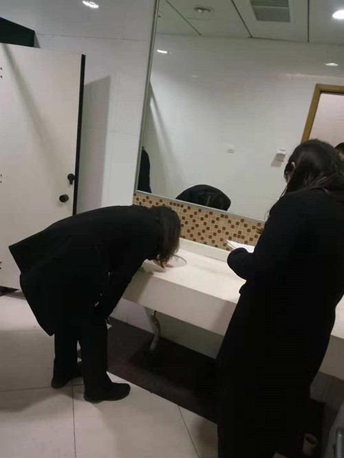 以下圖片是各場館衛生負責人及保潔主管認真檢查記錄各場館的衛生并相互交流工作心得的圖片介紹: