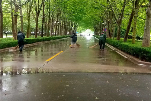 降雨前,檢查排水設施、收起室外所有宣傳牌及易被大風吹落的設施物資;降雨期間,全體人員明確分工,對重點區域專人定時巡查;降雨后,對滲水電梯井進行抽水處理,排查降雨期間出現的漏雨點,并整理上報機關事務服務中心。