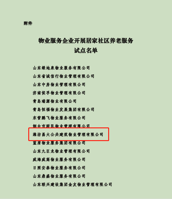 2021年9月6日,山東省住房和城鄉建設廳、山東省民政廳聯合公布了關于物業服務企業開展居家社區養老服務試點名單,我公司在首批試點名單之列。